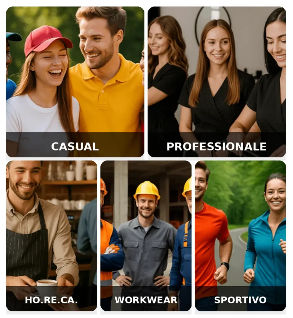 T-shirt, polo, felpe, pantaloni, giacche e accessori suddivisi per contesti d’uso: capi tecnici per l’ambito professionale e industriale, divise coordinate per ristorazione e accoglienza, HO.RE.C.A. soluzioni casual e sportive per il tempo libero e l’abbigliamento promozionale.