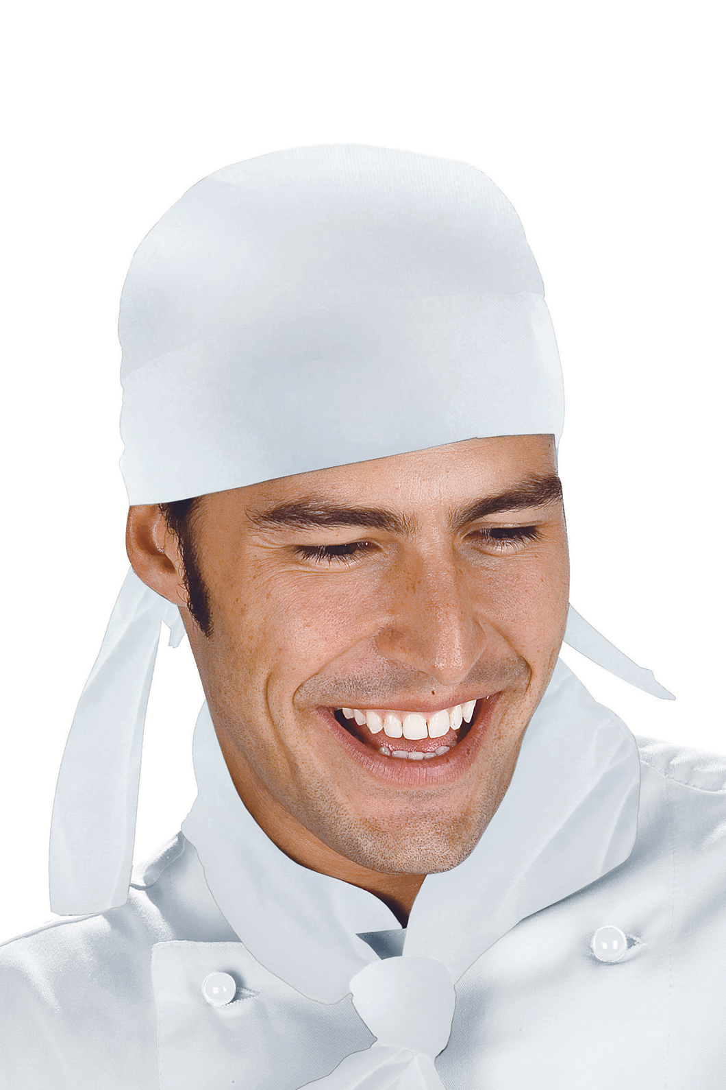 Bandana bianco. Ottima per il settore alberghiero e ristorazione. Ideale come divisa da lavoro per bar, pub, ristoranti, negozi alimentari, cucine e gelaterie. Alternativa bustina, cuffia o cappello.