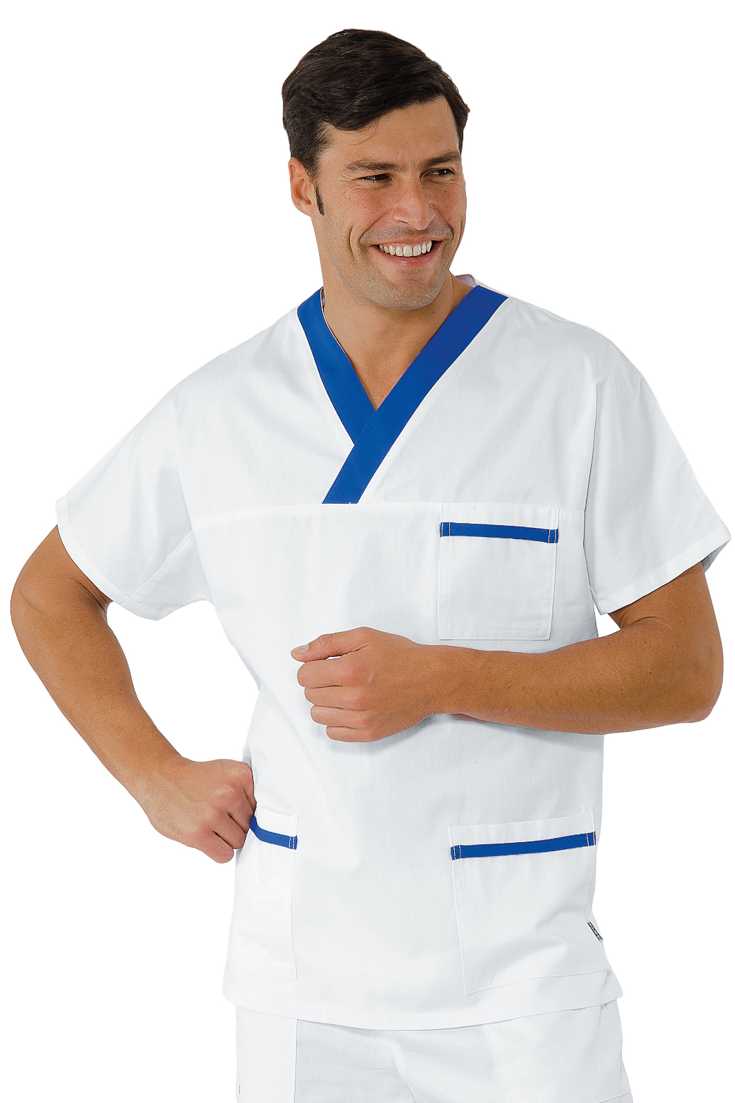 Casacca collo a V unisex con inserto a mezza manica smile. Per settore medicale, estetico, sanitario e ospedaliero. Ottima divisa da lavoro per medico ed infermiere uomo e donna. Con 2 tasche e taschino e contrasto al collo e alle tasche.