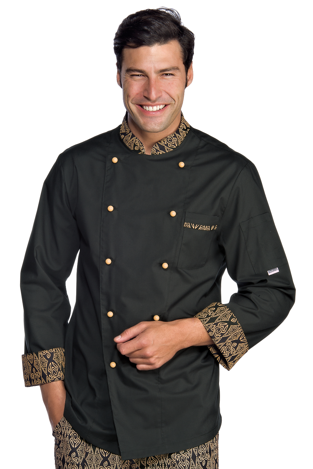 La Giacca da Cuoco con contrasto modello classico unisex a manica lunga bianco e nero. Ideale come divisa per uomo e donna da chef in cucina, ristorante o catering. Taschino al petto e alla manica con allacciatura con bottoni antipanico.