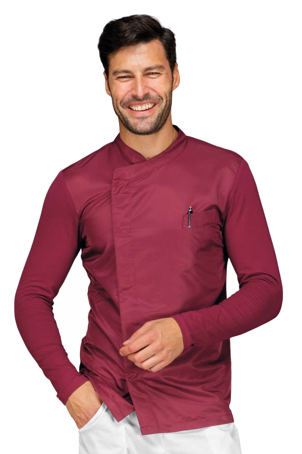 La Giacca da Cuoco Franklin unisex a manica lunga bianco. Ideale come divisa per uomo e donna da chef in cucina, ristorante o catering. Allacciatura asimmetrica con bottoni a pressione. Con taschino sul petto.