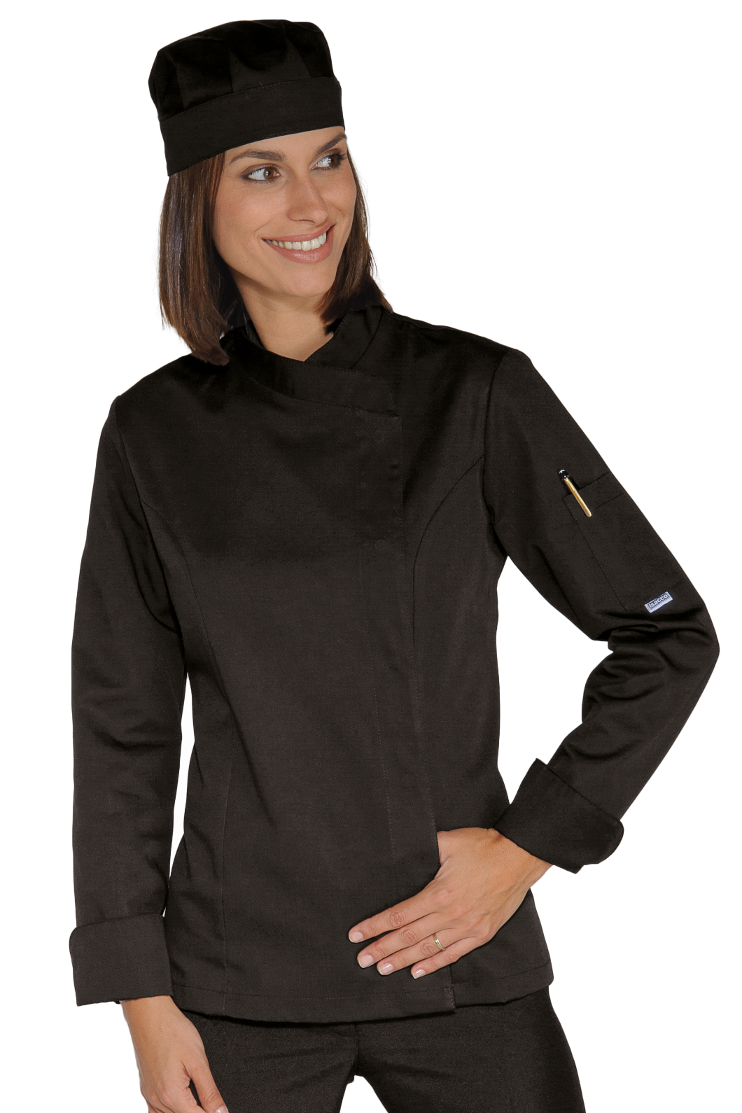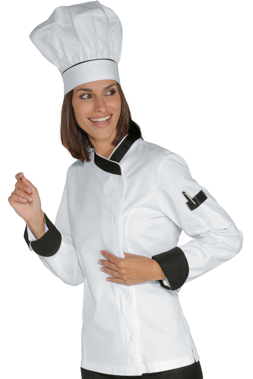 La Giacca da Cuoco Lady Snaps a manica lunga bianco. Ideale come divisa da chef in cucina, ristorante o catering. Taschino alla manica e allacciatura asimmetrica con bottoni a pressione. Con collo e polsi in contrasto, modello sciancrato.