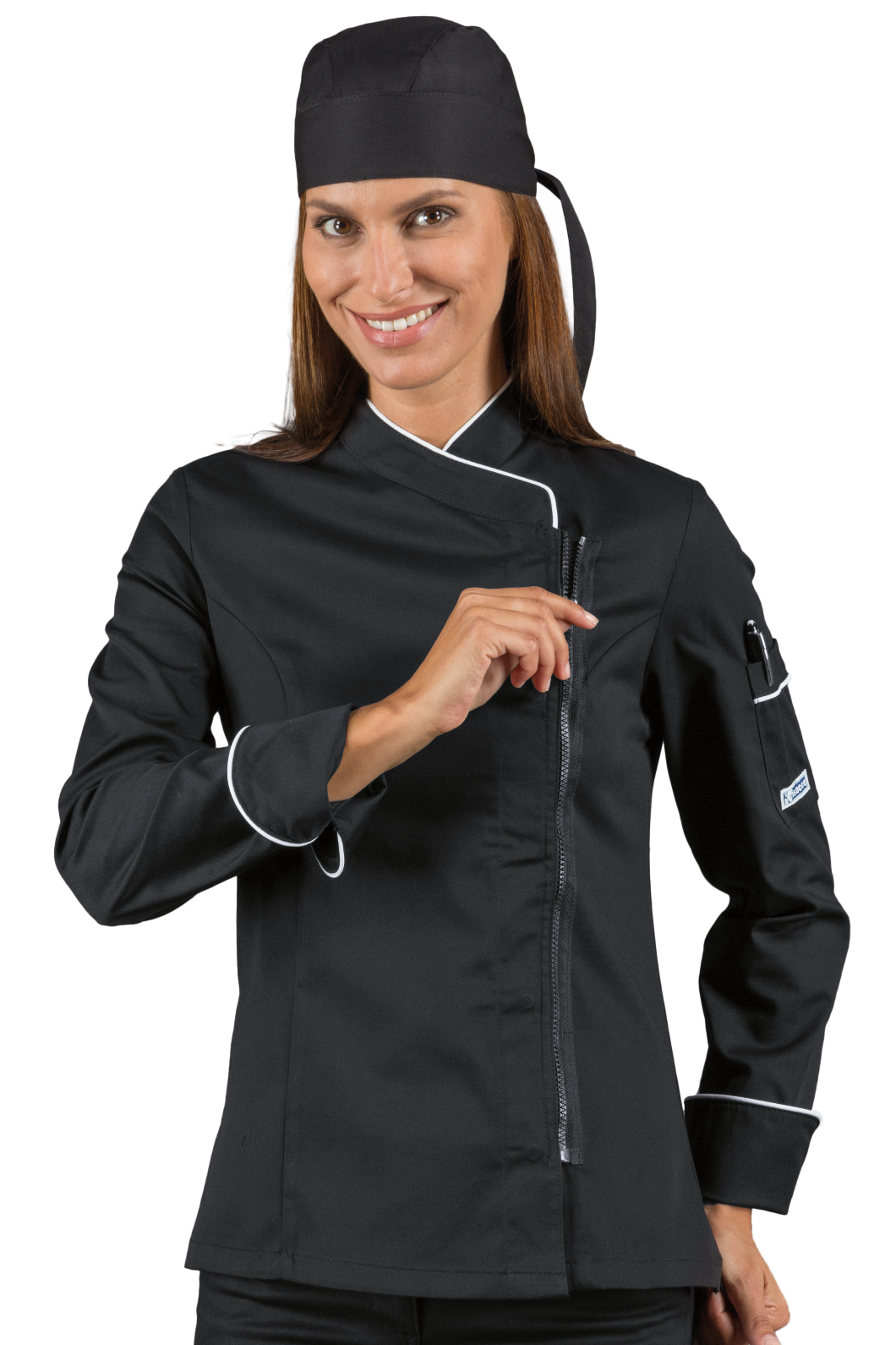 La Giacca da Cuoco Lady Zip a manica lunga bianco. Ideale come divisa da chef in cucina, ristorante o catering. Taschino alla manica e allacciatura asimmetrica con zip. Con collo e polsi in contrasto, modello sciancrato.