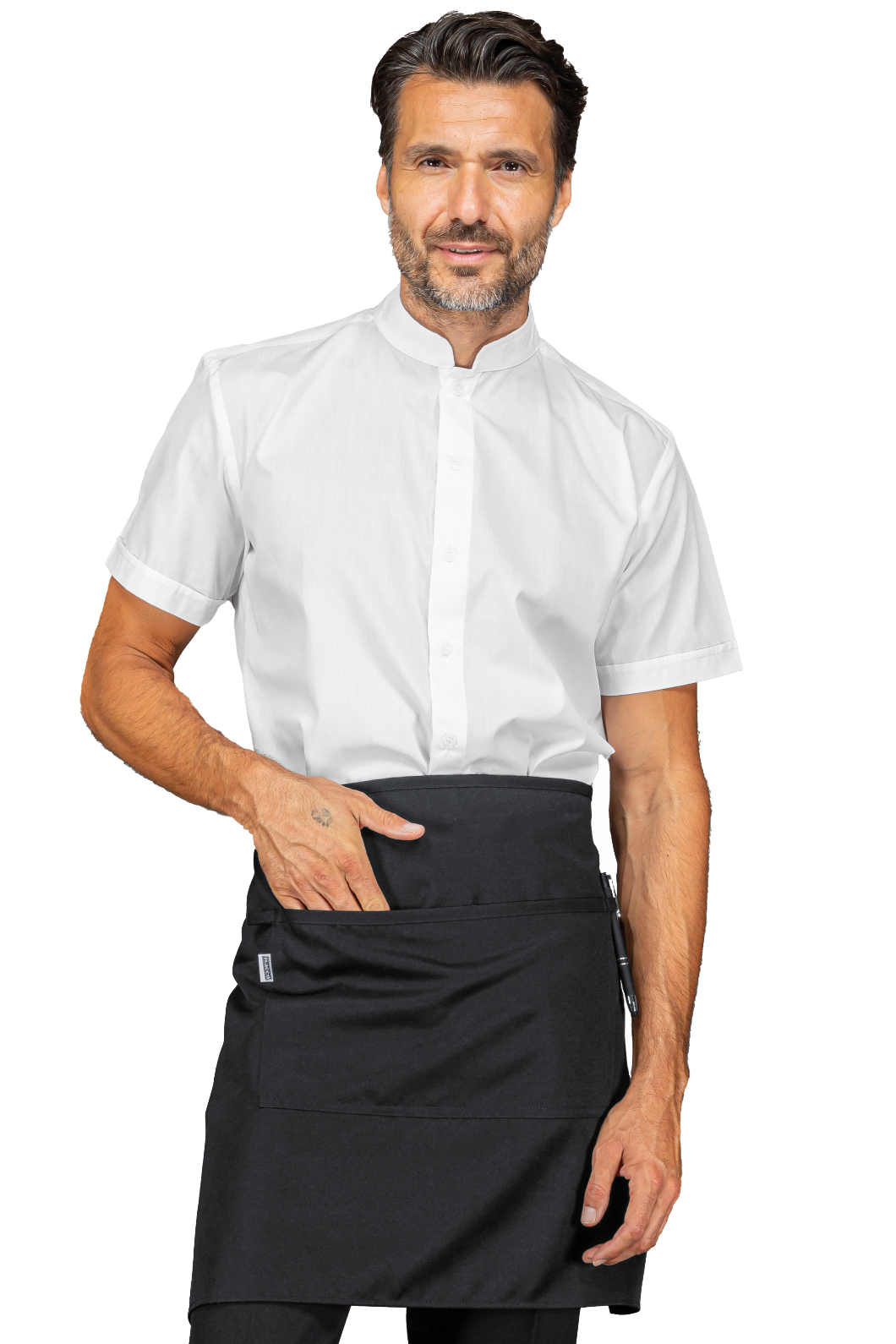 Grembiule unisex Leonida Isacco nero con inserti in pelle nero e tasca centrale. Con lacci in tessuto. Ideale per settore alberghiero e parannanza per ristorazione e cuoco. Divisa da lavoro per bar, pub, ristoranti, alimentari, cucine e catering.