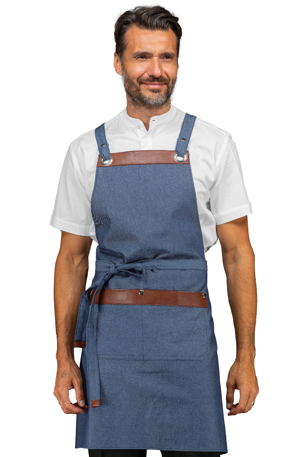 Grembiule Milford , Unisex con ampia tasca centrale in vita e con inserti in pelle nero. Ideale come divisa da lavoro per cantine, bar, enoteche e bistrot. Con allacciatura dietro al collo che ne permette la regolazione della pettorina.